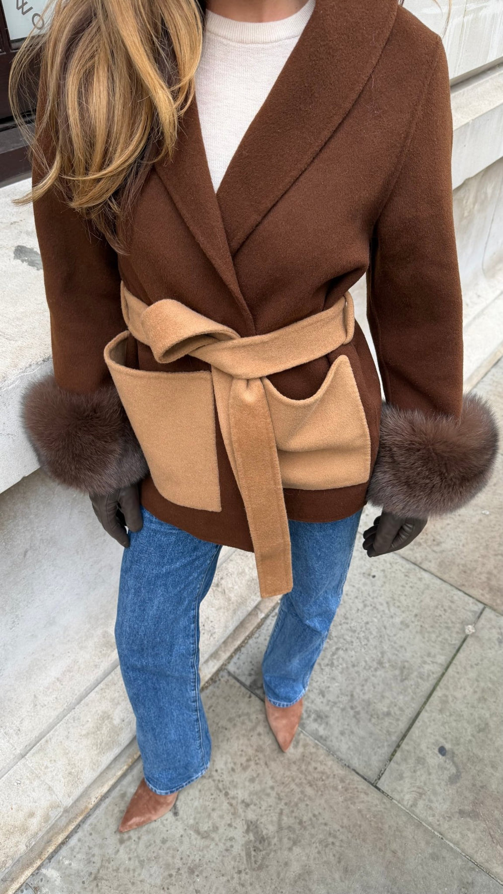 The Elodie by Aries x Rose is designed for women who want elegance without effort and warmth without weight. Made in a rich chocolate wool blend with soft faux fur cuffs and a contrast camel belt, this wrap coat moves with you and wraps beautifully around your shape. The oversized silhouette offers freedom and comfort while the belt gives you the option to define your waistline with a polished finish. Whether layered over everyday looks or styled for a winter evening, The Elodie is a piece that speaks without needing to shout.