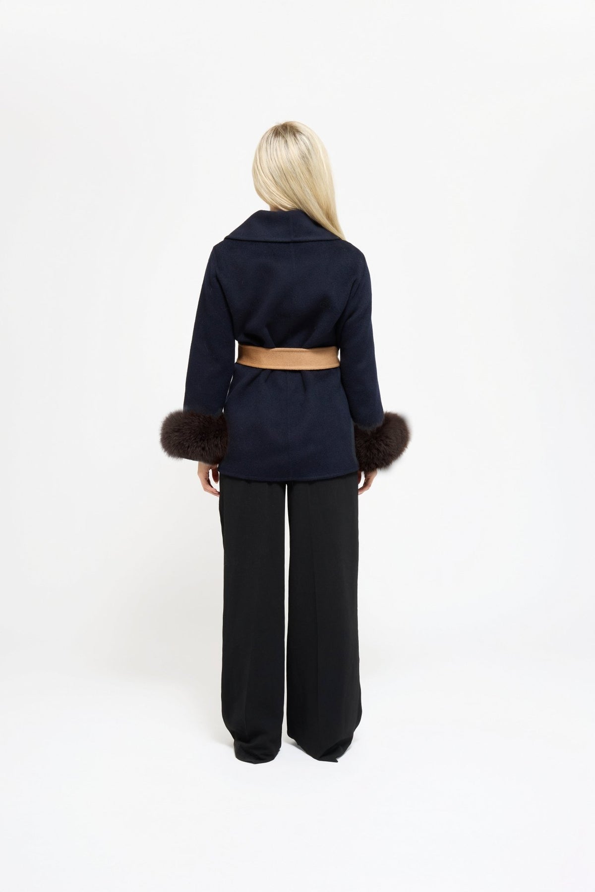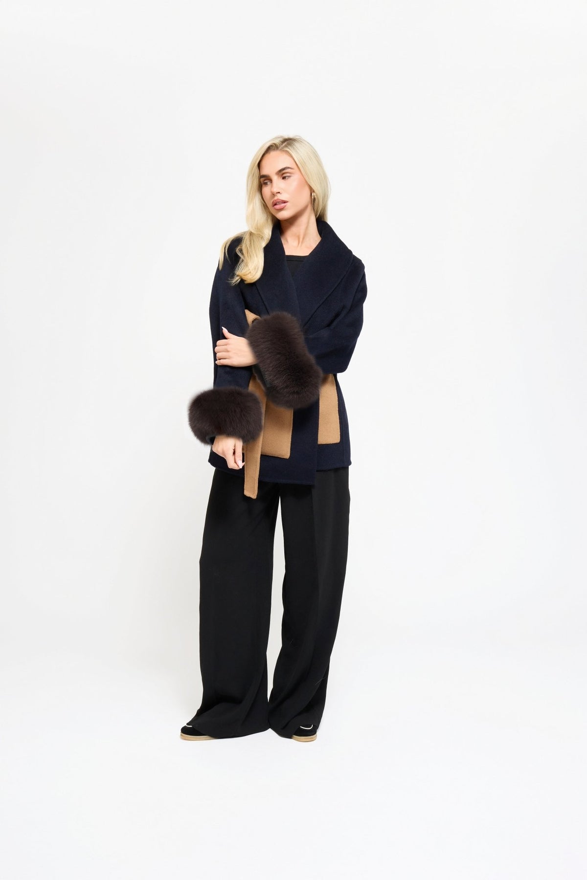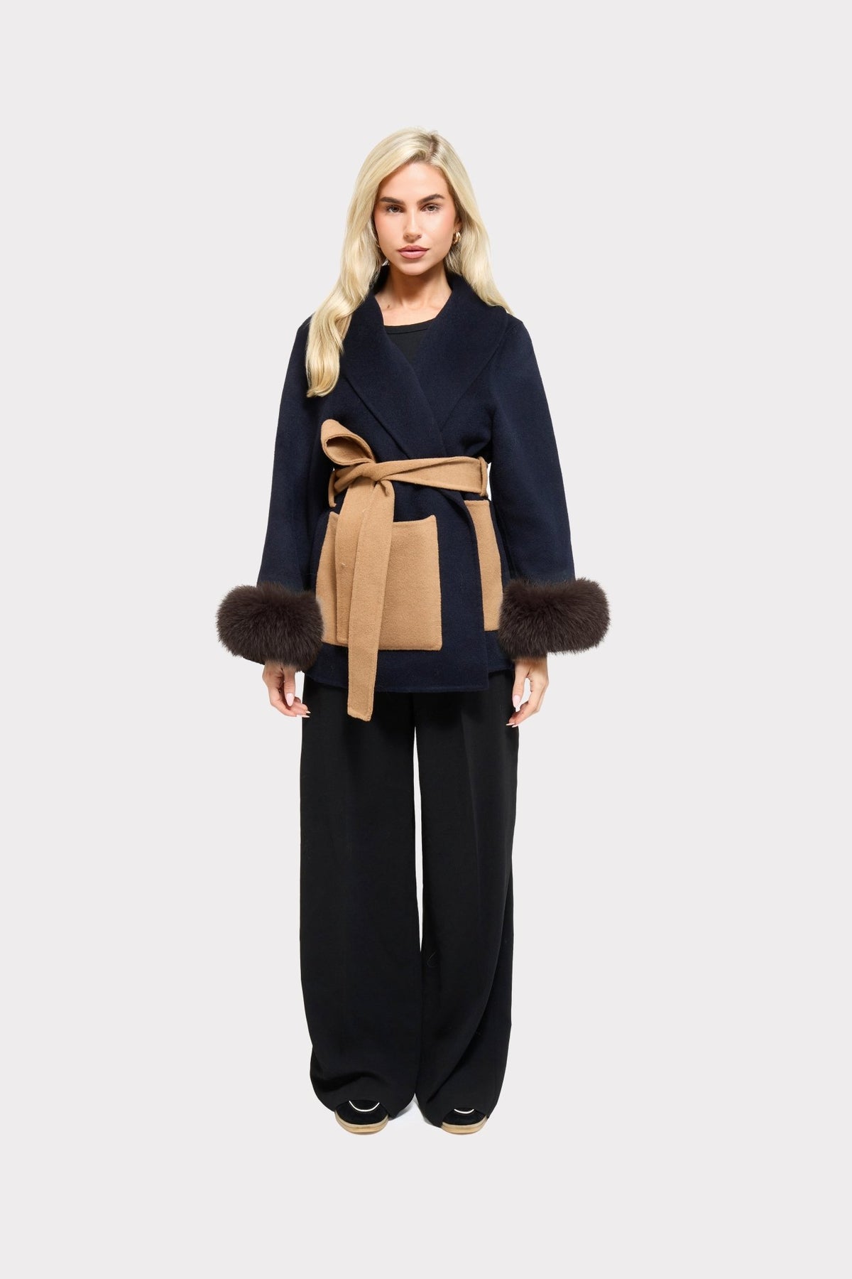 You deserve a coat that feels like quiet power the moment you tie the belt. The Nocturne by Aries x Rose wraps you in navy wool softness and frames your waist with a camel contrast belt that moves the way you move. Rich brown fur cuffs add warmth and a touch of drama, while the refined wrap silhouette keeps your look polished from daytime errands to evening plans. Slip it on and feel held, elegant, and completely you.