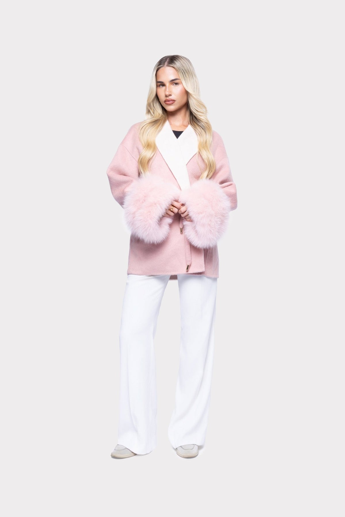 Soft blush that loves your skin, fur cuffs that feel like a whisper, and a wrap you tie the way you like. The Rosabelle by Aries x Rose is crafted from pure wool with a contrasting ivory lapel and a self-tie belt, shaping your waist while keeping you warm and confident from coffee runs to evening plans. Slip it on and feel polished, feminine, and beautifully seen.