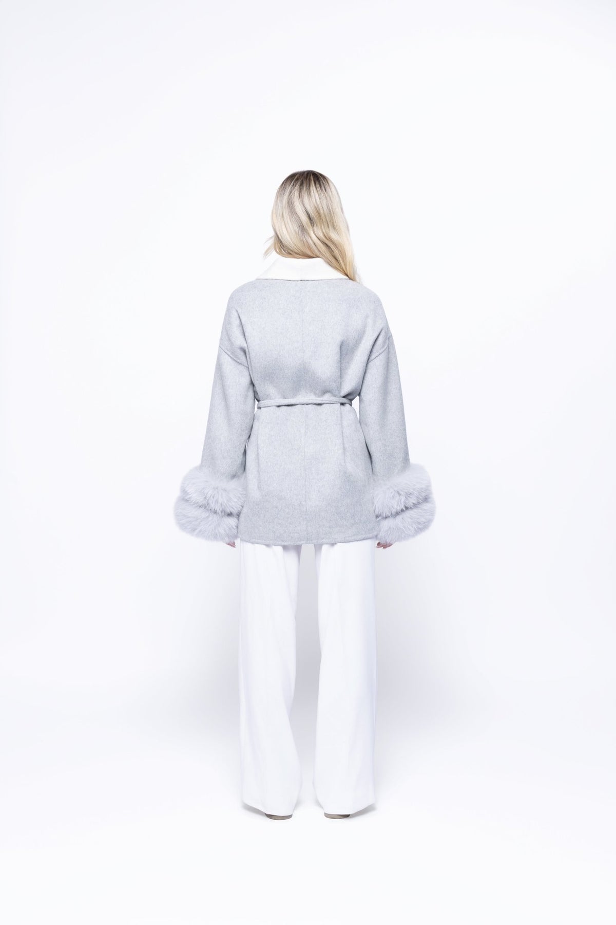 Silver grey that feels like winter light on your skin and an ivory lapel that brightens your face the moment you slip it on. The Sterling by Aries x Rose wraps you in pure wool with plush fur cuffs and a self tie belt so you shape your waist your way. The silhouette is soft yet polished, easy for daytime and quietly glamorous for evening, giving you that calm confidence you love to carry.