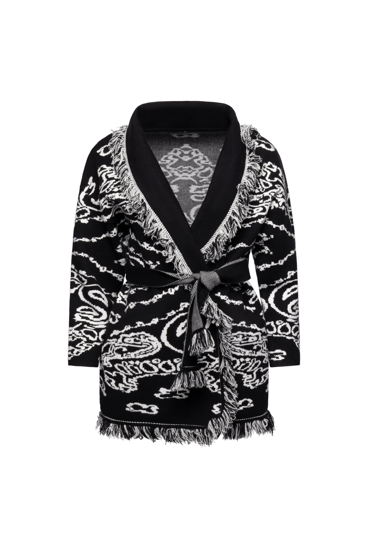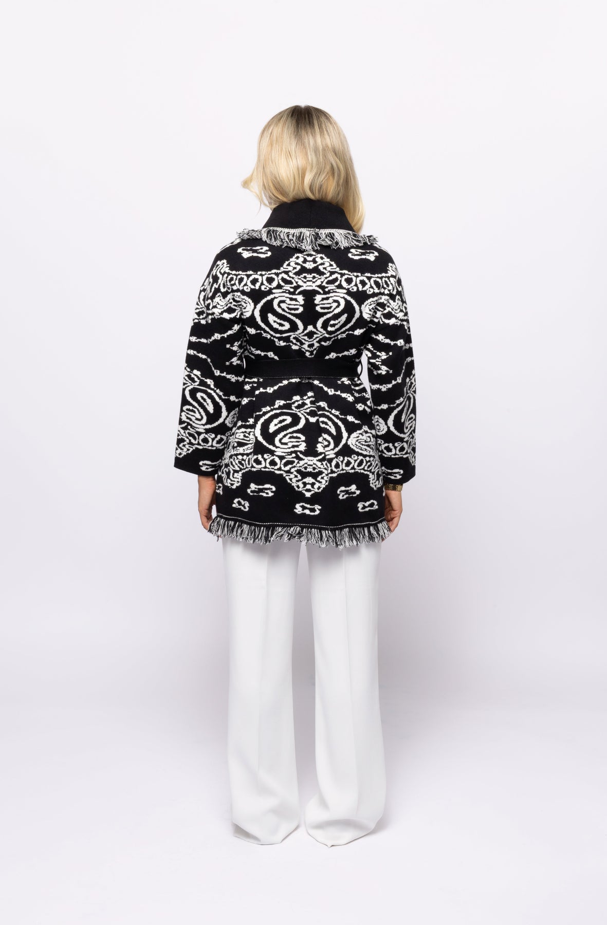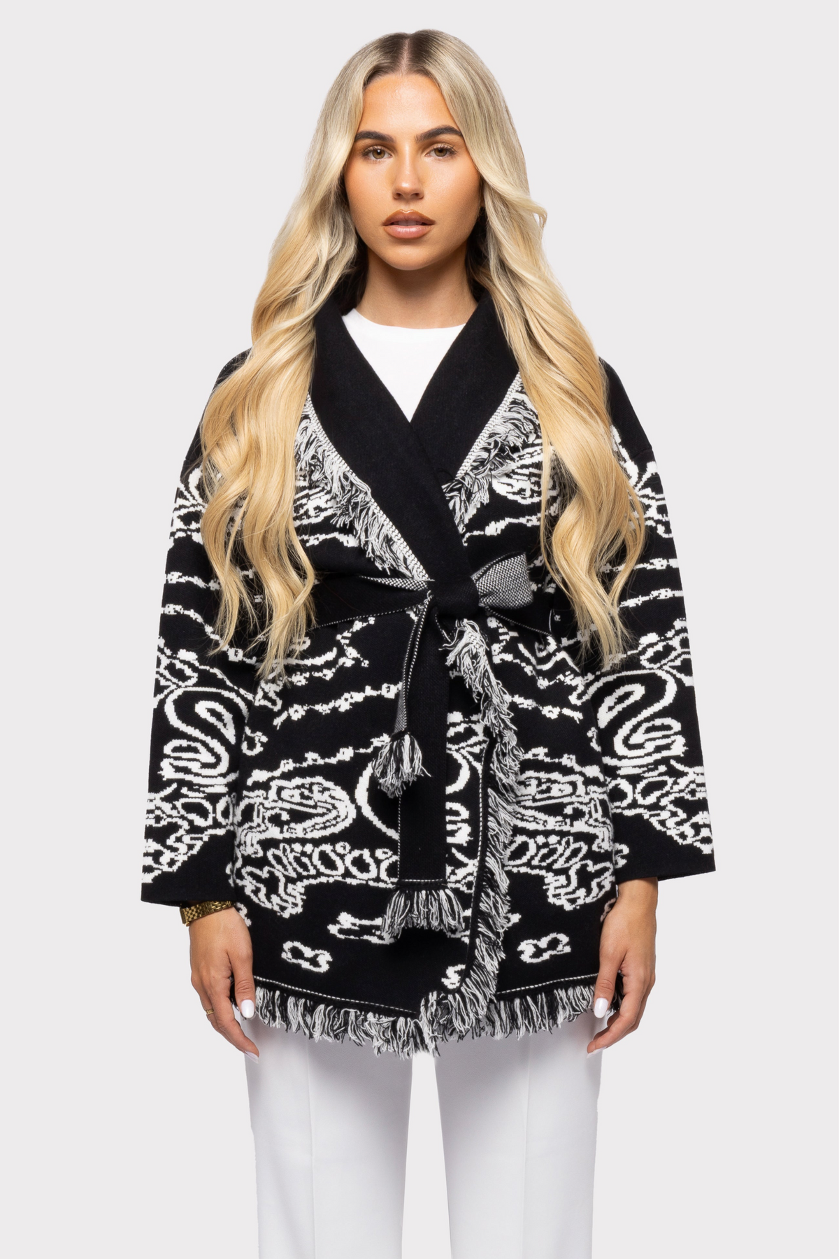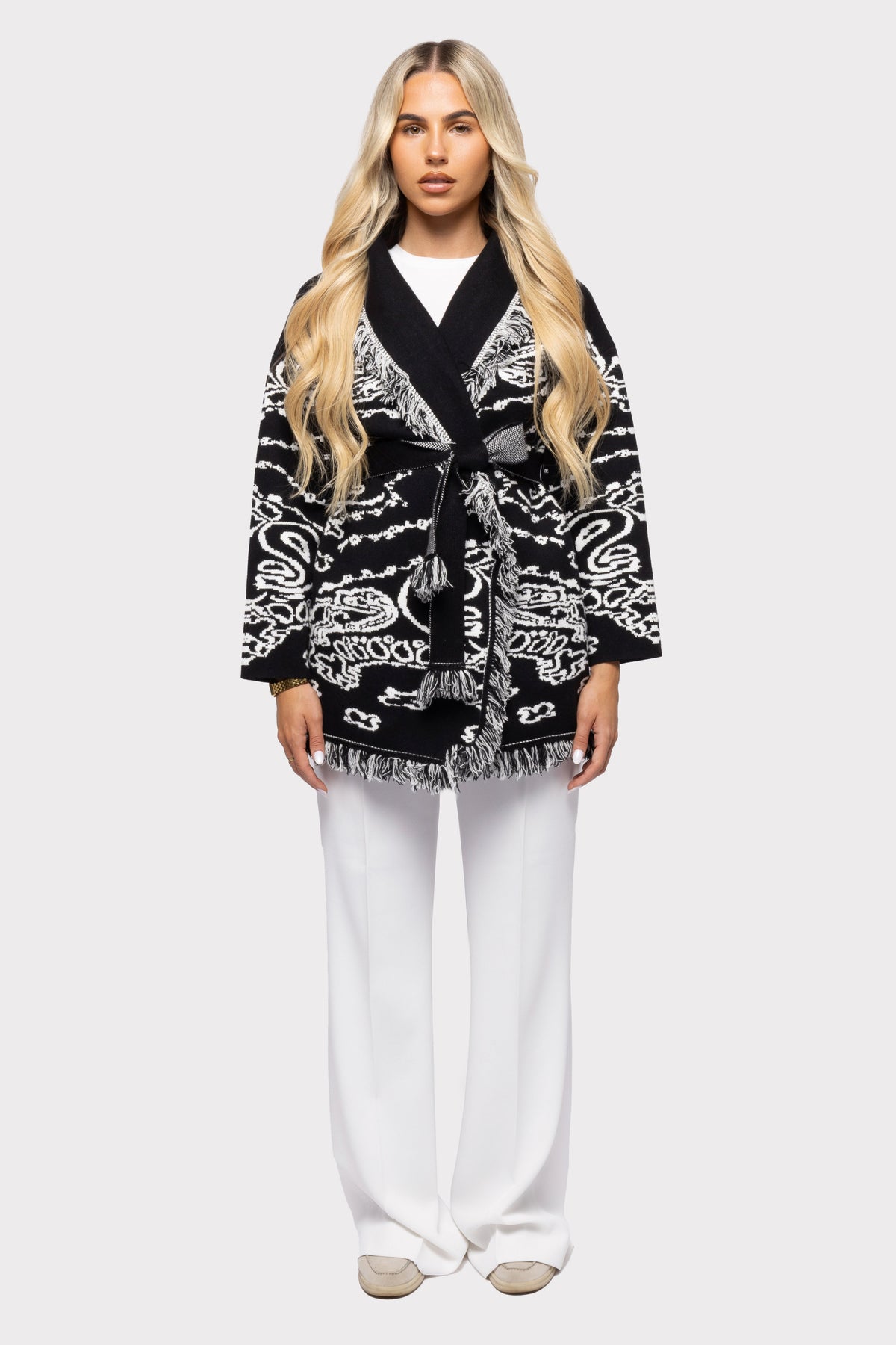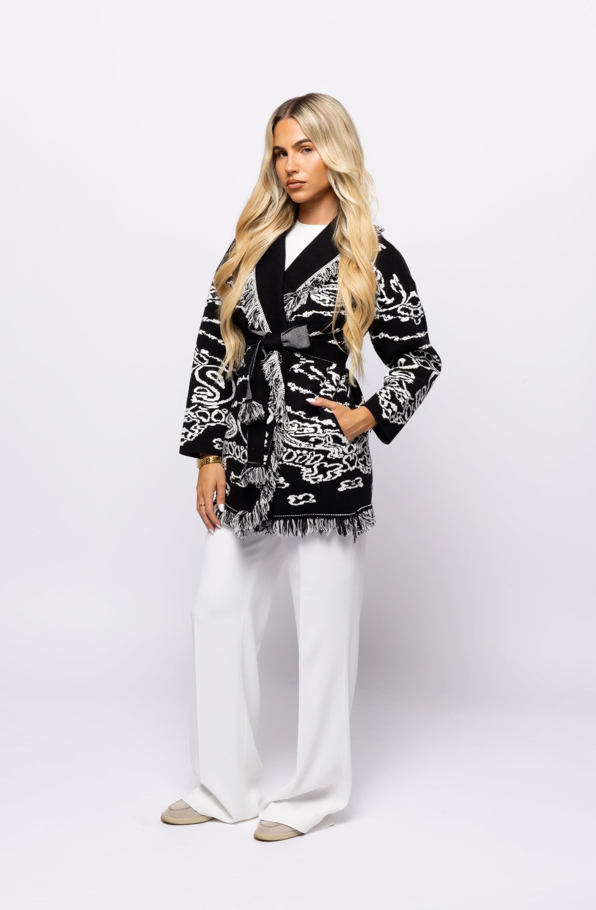 Wrap yourself in timeless elegance with the "Noir Whisper" where quiet luxury meets effortless edge. This statement knit is crafted from a premium, ultra-soft blend that flows with your every move. The deep midnight black base is artfully adorned with intricate white paisley embroidery, tonal fringe hem detailing, and a waist-cinching tie belt to sculpt your silhouette your way.