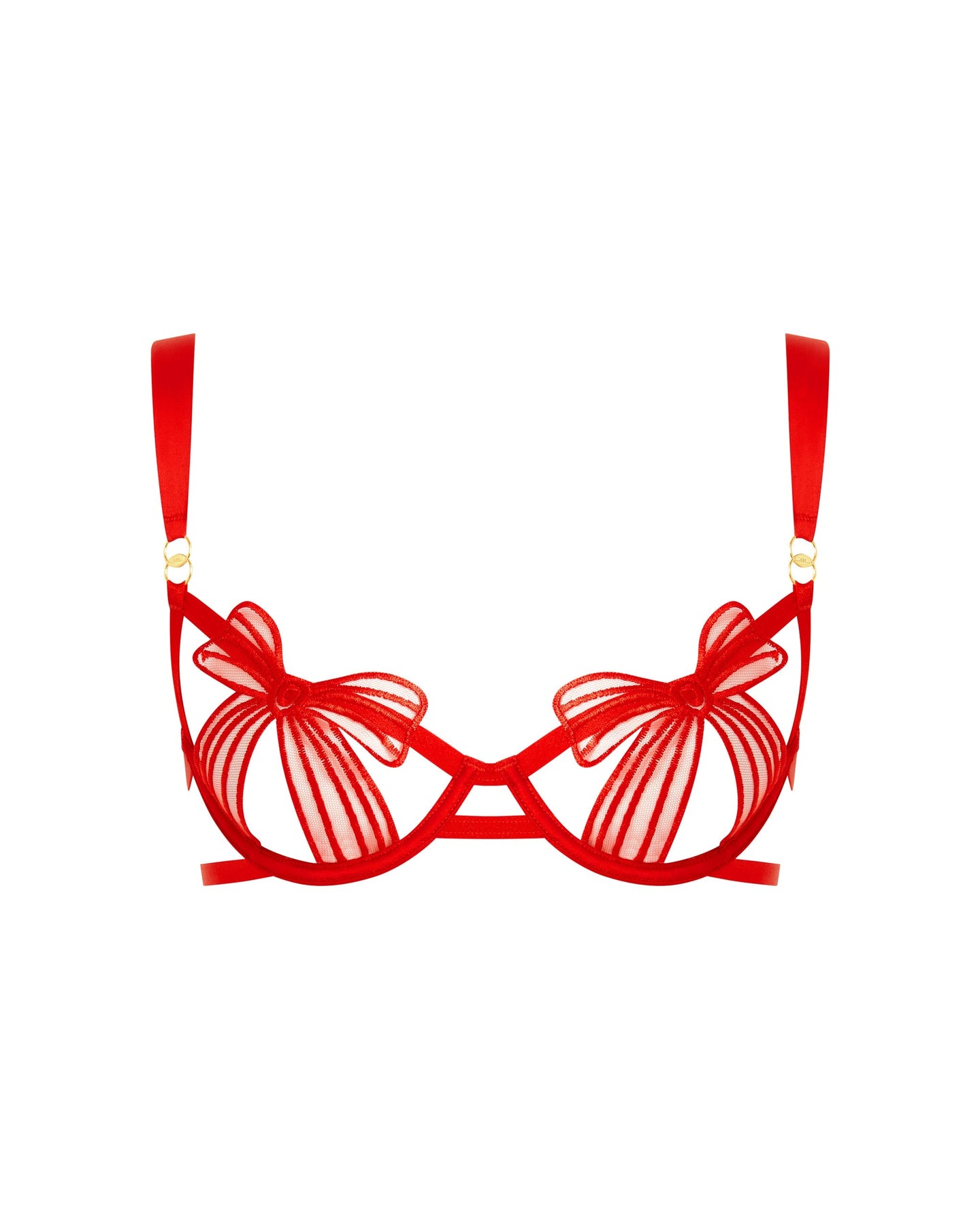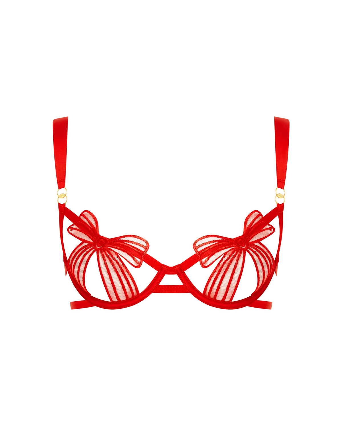 Let your playful side show in a bra that feels made for you. Ribbon Kiss frames your curves with soft sheer mesh and satin strapping, finished with sculpted bow details that sit beautifully on your skin. The underwired cups lift and shape, the semi open design teases without sacrificing support, and the adjustable straps with a hook and eye back help you lock in your perfect fit. Slip it on for a special night or any day you want your confidence a little louder.