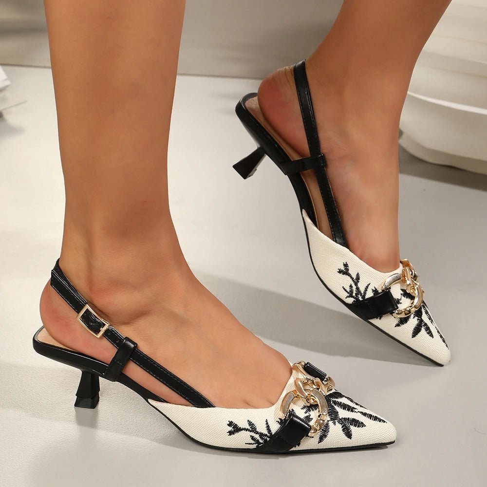 Step into elegance with the Marvella Embroidered Slingbacks, crafted for women who love timeless style with a modern edge. These low kitten heels feature delicate floral embroidery, a graceful pointed toe, and an adjustable ankle strap buckle for a secure and flattering fit. Designed for all-day comfort, they're the perfect match for weddings, formal events, office wear, or casual chic days. Whether you're heading to work or out for the evening, these embroidered slingback heels add a refined touch to every outfit.